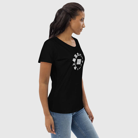 Women's black fitted organic cotton t-shirt with Japanese 2269 party circle