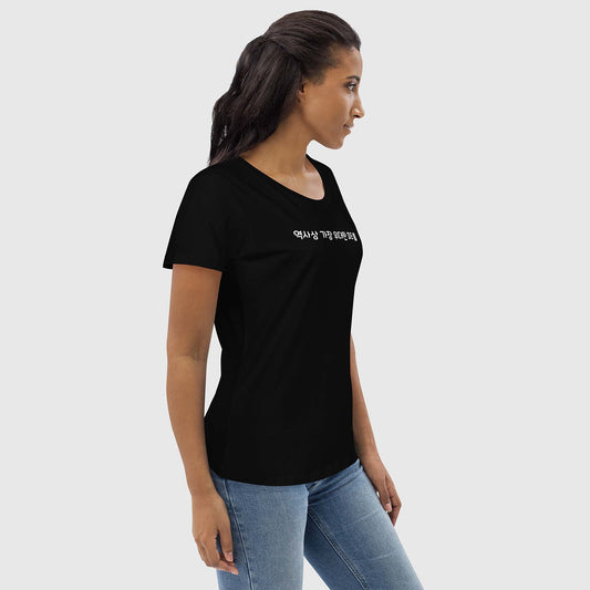 Women's black fitted organic cotton t-shirt with Korean 2269 party message