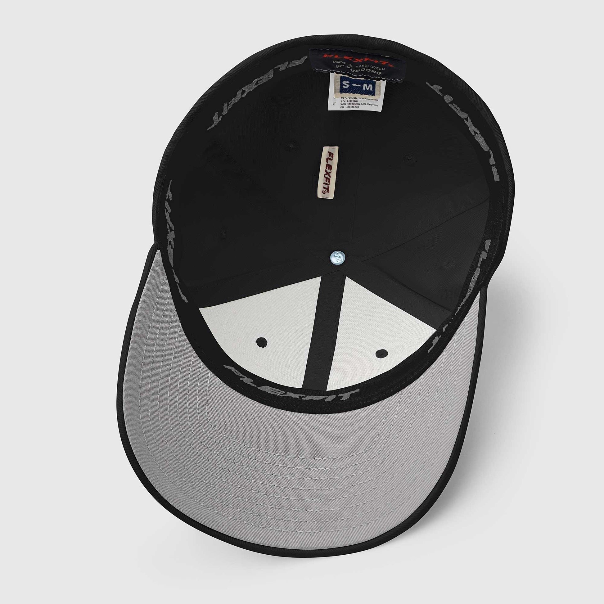 Black fitted baseball hat with subtle embroidery front and back